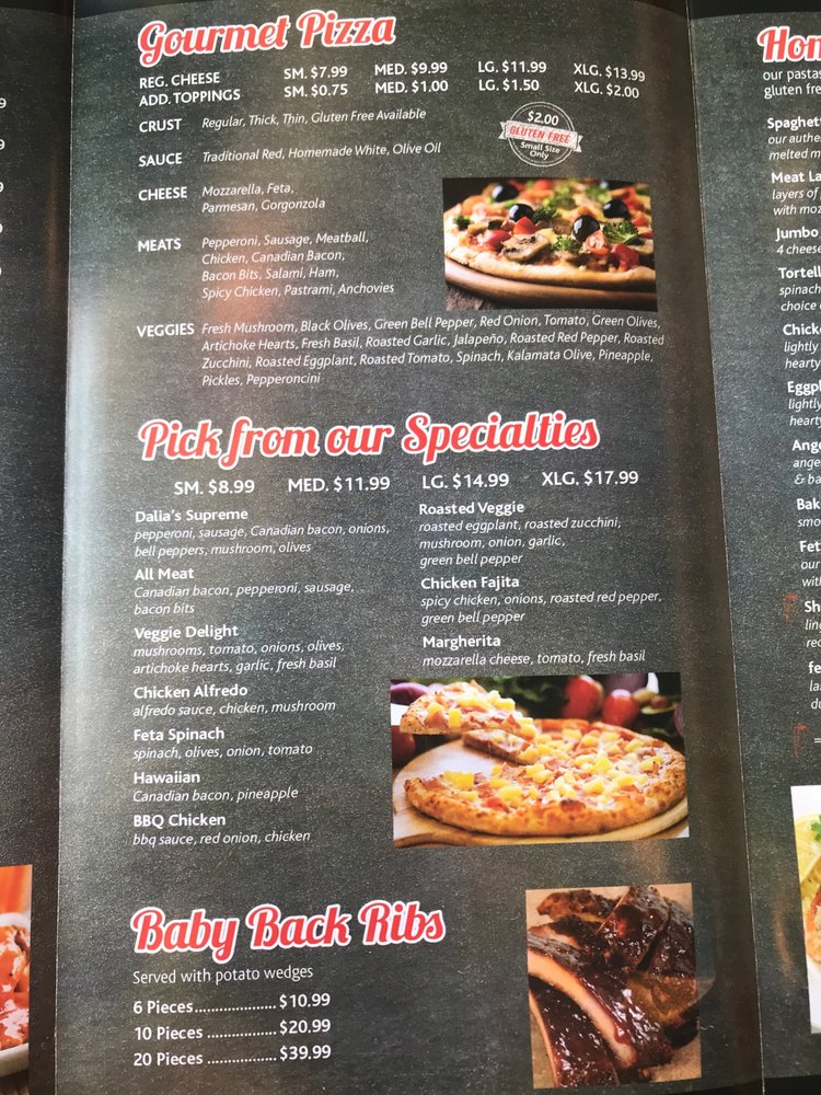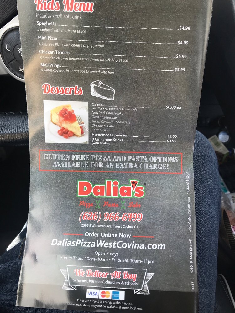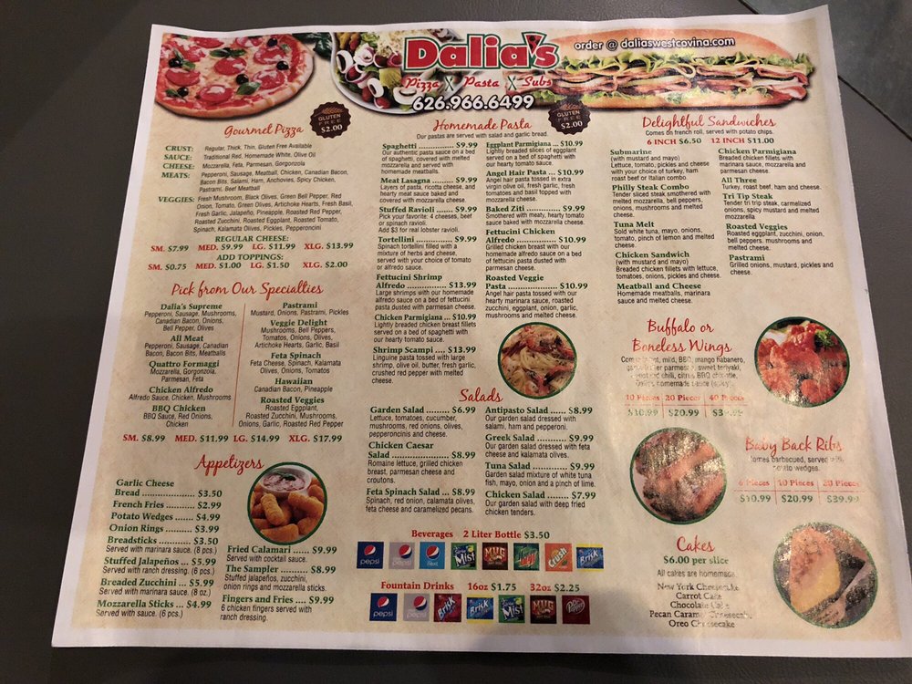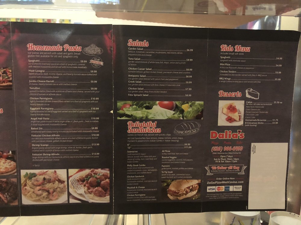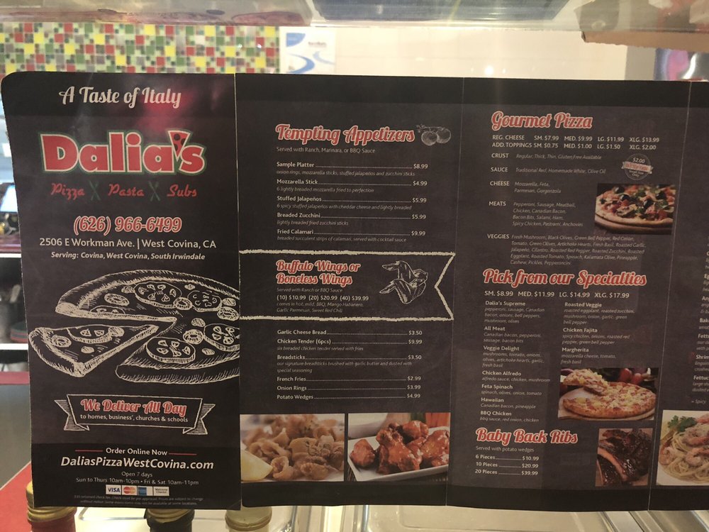 Dalia’s Pizza in West Covina, CA offers a delightful menu featuring calzones, strombolis, specialty pizzas, and sandwiches. The restaurant caters to various dietary preferences with vegan and vegetarian options available. Their dishes include flavorful choices like the Tri Tip Steak Sandwich and the Quattro Formaggi pizza. Customers praise the friendly staff and efficient service, making it a go-to spot for quick and tasty meals. While some reviewers suggest improvements in certain dishes, overall, Dalia’s Pizza remains a popular choice for families and individuals alike. With a diverse menu and a cozy atmosphere, Dalia’s Pizza is a must-try for pizza lovers in the area.